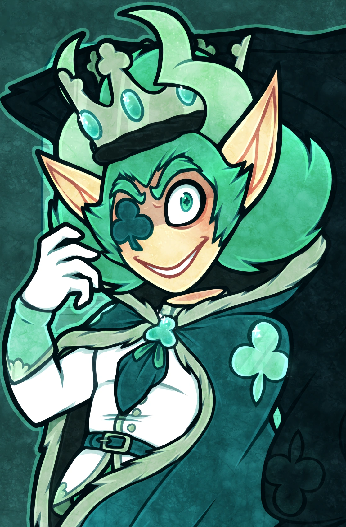 Clover is 176cm tall and of average weight. He has mint green eyes, with his right eye being replaced with a dark green Club.