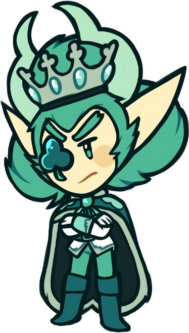 He has pale skin and jade green hair styled in the shape of the Clubs symbol. He also has greyish green curved horns and he wears a crown.